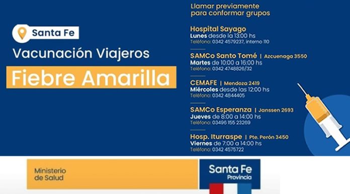 Desde el Ministerio de Salud detallaron los vacunatorios para aplicarse la vacuna contra la fiebre amarilla. En Esperanza se puede vacunar en el Samco (Janssen 2693) los jueves en el horario de 8 a 14 o solicitar turno al 03496 155 23269.